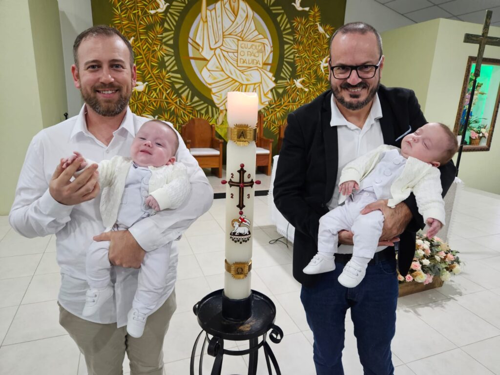Noah e Gael, gêmeos, fruto de um relacionamento entre Bertson Campos e Mauricio Tombini, que foram gerados em uma barriga solidária, foram batizados hoje, na Igreja Dom Bosco de Itajai. A cerimônia causou muita emoção !!! Um relacionamento de dez anos e um sonho ! TER FILHOS !!! MUITAS FELICIDADESSSS !!!!!!!!!!!! Clicks gerais