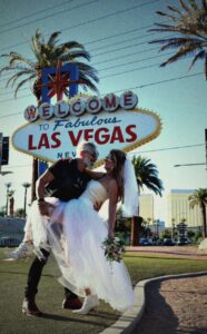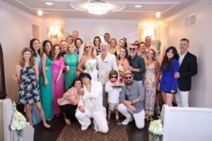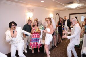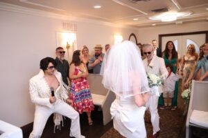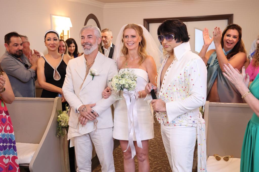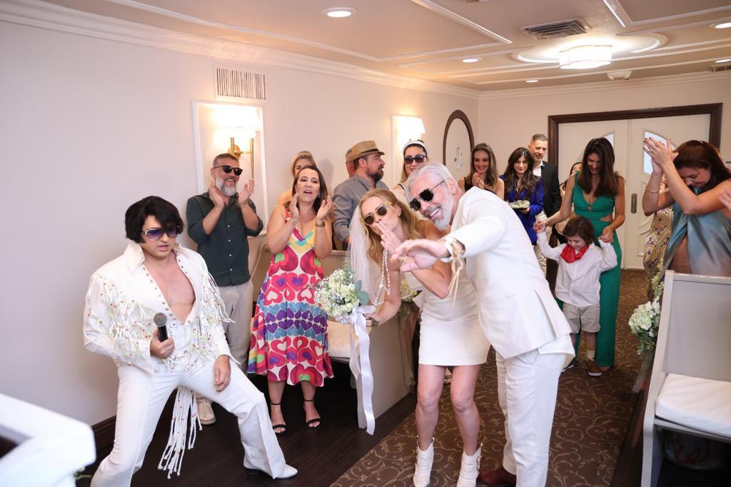 Amigos e familiares do Brasil e dos Estados Unidos reuniram-se na Wedding Graceland Chapel para celebrar esta união, que contou com a participação especial do Elvis Cover de Vegas cantando hinos do rei do rock durante a celebração.