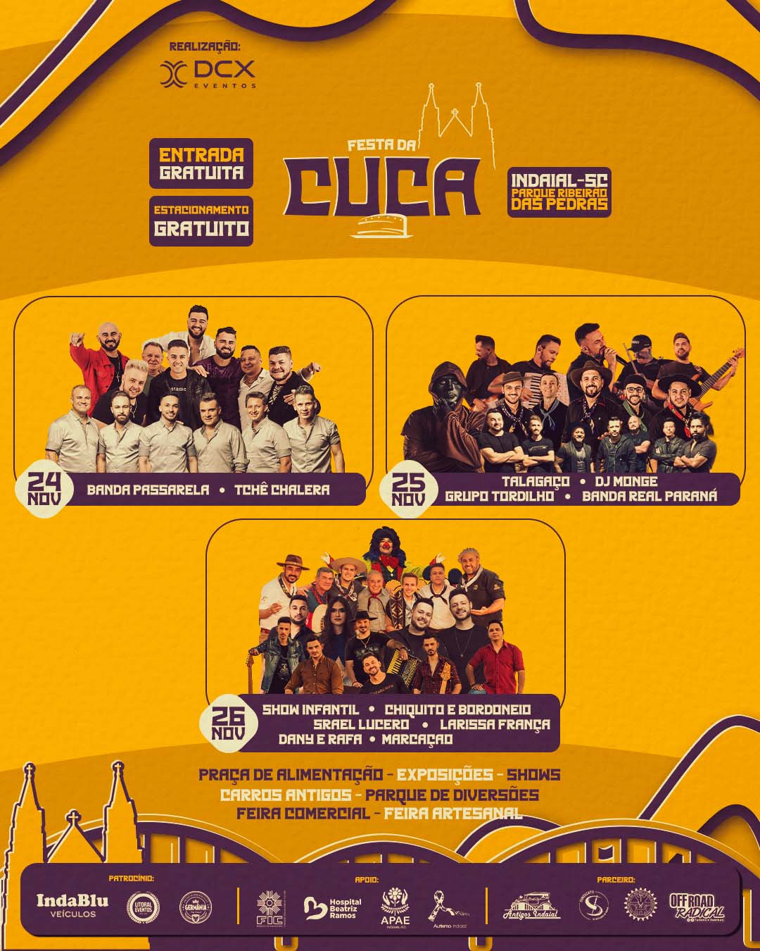 O evento ainda terá feira artesanal com o tema e participação de entidades regionais como o Hospital Filantrópico Beatriz Ramos, a Associação Autismo Indaial e a Apae da cidade. Para agitar ainda mais a região, a 1ª Festa da Cuca contará com diversas atrações culturais e shows. No palco da praça de alimentação passarão grandes apresentações como do Tchê Chalera e Banda Passarela, na sexta-feira (24/11); Talagaço, DJ Monge, Grupo Tordilho e Banda Real Paraná, no sábado (25/11); e fecha com show infantil e apresentações de Marcação, Dany e Rafa, Larissa França, Israel Lucero e Chiquito e Bordoneio, no domingo (26/11). O evento ainda terá espaço para parque de diversões, tarde da melhor idade, feira comercial e exposição de carros antigos.