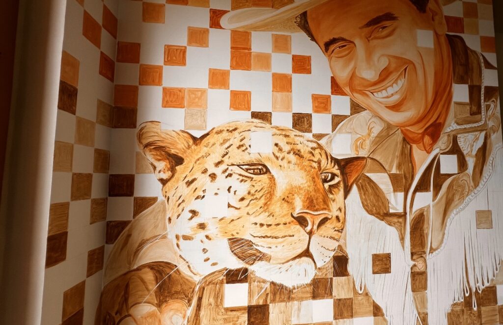 Tinta de terra: Artista plástico retrata Beto Carrero e o leopardo Marco na entrada do parque