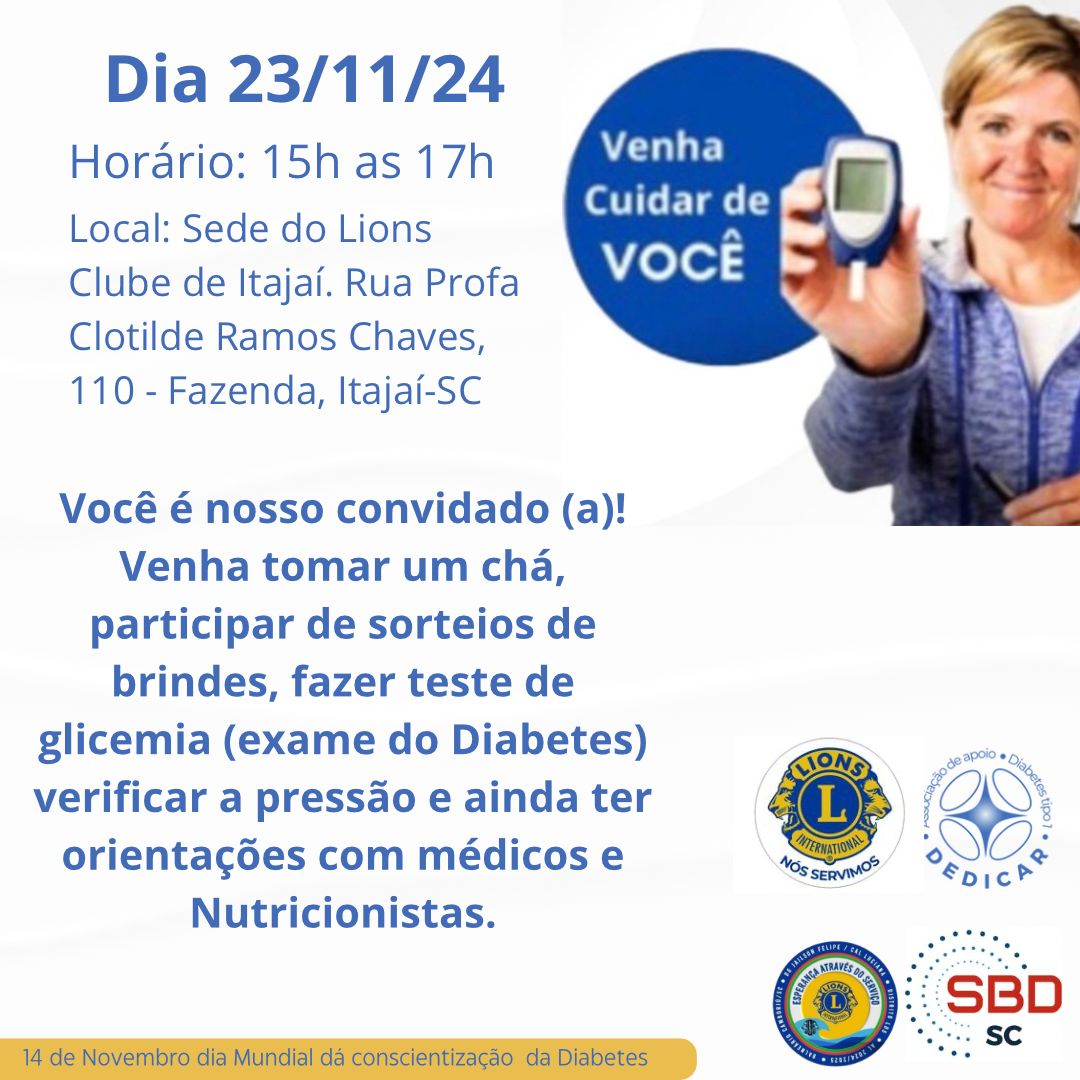 O Lions Clube de Itajaí Centro, Itajaí Verde Vale, Itajaí Sul, Itajaí Aliança e Itajaí Praia estão promovendo uma campanha de conscientização sobre o diabetes, oferecendo orientações gratuitas para a comunidade. Este evento é uma excelente oportunidade para aprender mais sobre a saúde e a prevenção do diabetes.