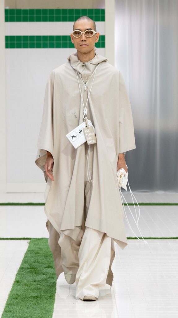 Enquanto o legado da Lacoste nos esportes serve de alicerce para as criações de Pelagia, a autenticidade crua evolui para contrastes refinados e frescos entre transparência e opacidade, conforto e fluidez, inspiração no esporte e elegância despretensiosa. Sensualidade, proporções inacabadas e herança esportiva combinadas ao sportswear vintage são a base para um armário elegante que não deixa de ser vibrante, com polos transparentes, peças marcantes em couro espelhado, trench coats que remetem à robes marcados com a frase “Tennis for Everyone” e peças ultraleves de nylon e seda tecnológica que contrastam, criando tensão, com itens utilitários de algodão emborrachado e de nylon de efeito molhado.